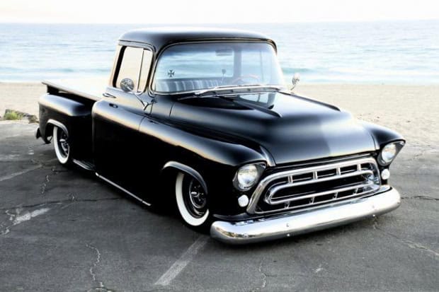 1957 Chevy Pickup Truck with a sleek black paint job and white wall tires.